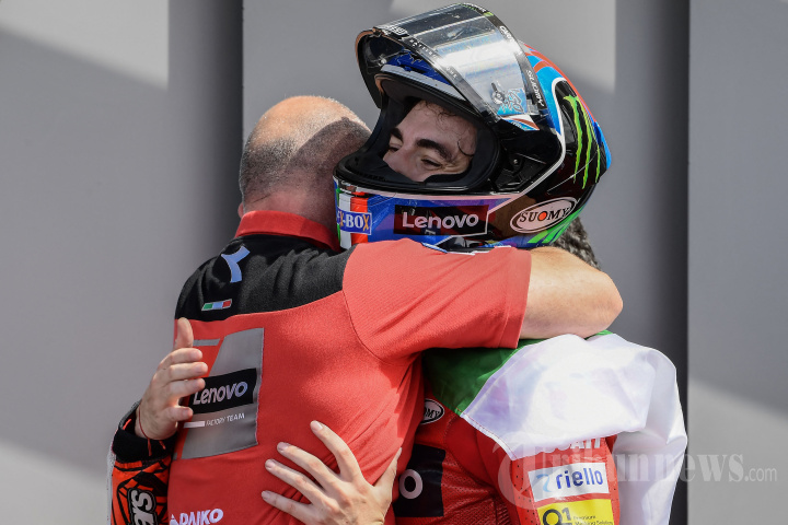 Pembalap Ducati Tim Lenovo Italia Francesco Bagnaia merayakan kemenangannya setelah memenangkan Grand Prix Moto GP Italia di trek balap Mugello, Tuscany, pada 29 Mei 2022. (Photo by Filippo MONTEFORTE / AFP)