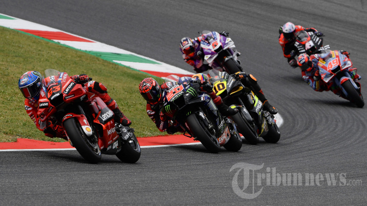 (Dari kiri) Pembalap Ducati Lenovo Team Italia Francesco Bagnaia, Pembalap Prancis Monster Energy Yamaha Fabio Quartararo, Pembalap Mooney VR46 Racing Ducati Italia Luca Marini, Pembalap Gresini Racing Ducati Italia Fabio Di Giannantonio (kanan) dan sesama pebalap bersaing selama Moto GP Grand Italia Prix ??di trek balap Mugello, Tuscany, pada 29 Mei 2022. (Photo by Filippo MONTEFORTE / AFP)