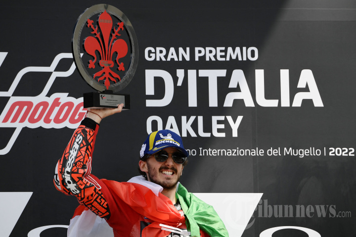 Pembalap tim Ducati Lenovo Italia Francesco Bagnaia merayakan di podium setelah memenangkan Grand Prix Moto GP Italia di trek balap Mugello, Tuscany, pada 29 Mei 2022. (Photo by Filippo MONTEFORTE / AFP)