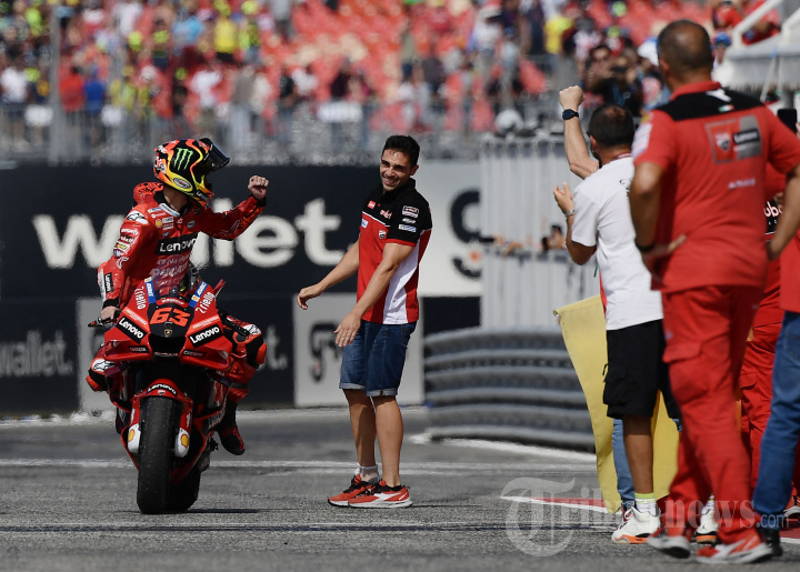 Pebalap Ducati Lenovo Italia Francesco Bagnaia merayakan kemenangan setelah balapan MotoGP San Marino di Sirkuit Dunia Misano Marco-Simoncelli di Misano Adriatico pada 4 September 2022. (Photo by Filippo MONTEFORTE / AFP)