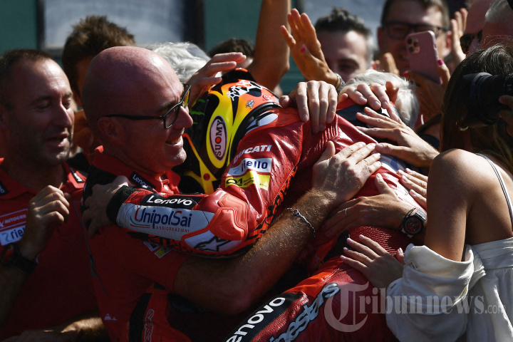 Pebalap Ducati Lenovo Italia Francesco Bagnaia merayakan kemenangan bersama rekan setimnya setelah balapan MotoGP San Marino di Sirkuit Dunia Misano Marco-Simoncelli di Misano Adriatico pada 4 September 2022. (Photo by Filippo MONTEFORTE / AFP)