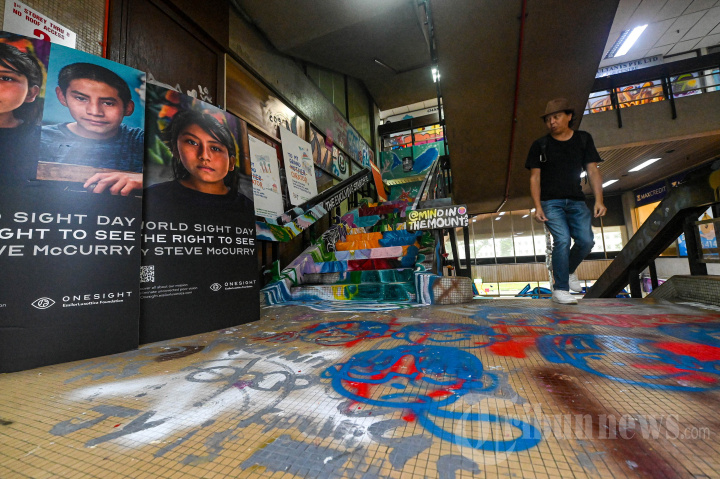Dalam foto yang diambil pada 19 Januari 2024 ini, seorang pria berjalan melewati gambar dan grafiti di Peace Centre, sebuah mal terbengkalai yang berubah menjadi kawasan seni tak terduga, di Singapura. Di Singapura, di mana grafiti dilarang, para kreatif muda telah mengambil alih mal yang ditinggalkan, melukis mural warna-warni, dan mengadakan lokakarya seni untuk menghidupkan kembali mal tersebut. (Photo by Roslan RAHMAN / AFP)