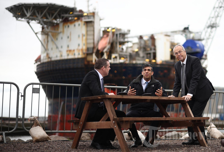 Perdana Menteri Inggris yang juga sebagai pemimpin Partai Konservatif Rishi Sunak (tengah) dan Pemimpin Konservatif dan Unionis Skotlandia, Douglas Ross (Kiri) berbicara dengan kepala Global Energy, Roy Macgregor (kanan) di fasilitas Global Energy Group di Pelabuhan Nigg di utara -Skotlandia timur pada 23 Mei 2024, saat acara kampanye menjelang pemilihan umum Inggris pada 4 Juli. (HENRY NICHOLLS / POOL / AFP)