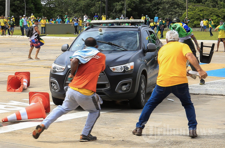 Pendukung mantan Presiden Brasil Jair Bolsonaro menyerang kendaraan Polisi Militer selama bentrokan di luar Istana Kepresidenan Planalto di Brasilia pada 8 Januari 2023. - Ratusan pendukung mantan presiden sayap kanan Brasil Jair Bolsonaro menerobos barikade polisi dan menyerbu Kongres , istana kepresidenan dan Mahkamah Agung hari Minggu, dalam protes dramatis terhadap pelantikan Presiden Luiz Inacio Lula da Silva minggu lalu.