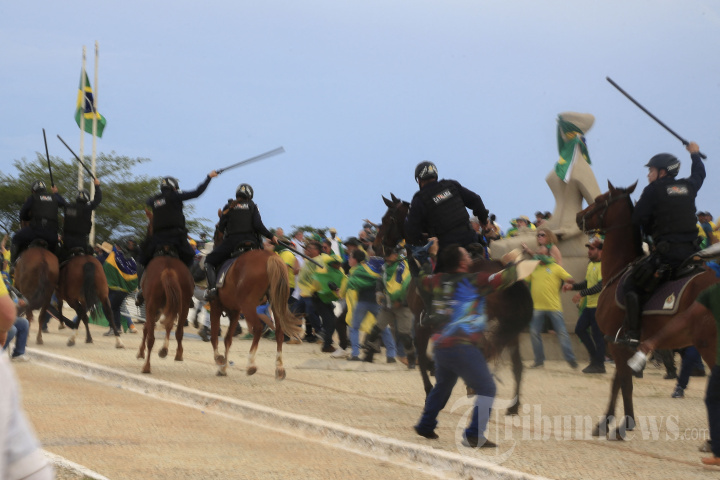 Pendukung mantan Presiden Brasil Jair Bolsonaro bentrok dengan polisi anti huru hara saat mereka menyerbu Istana Kepresidenan Planalto di Brasilia pada 8 Januari 2023. - Ratusan pendukung mantan presiden sayap kanan Brasil Jair Bolsonaro menerobos barikade polisi dan menyerbu Kongres, presiden istana dan Mahkamah Agung hari Minggu, dalam protes dramatis terhadap pelantikan Presiden Luiz Inacio Lula da Silva minggu lalu. (Photo by Sergio Lima / AFP)