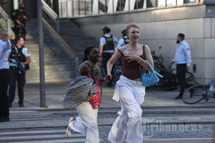 Orang-orang terlihat berlarian saat polisi mengevakuasi pusat perbelanjaan Fields di Kopenhagen, Denmark, pada 3 Juli 2022 setelah media Denmark melaporkan penembakan. - Tembakan di sebuah mal Kopenhagen menyebabkan beberapa orang tewas, dan beberapa polisi Denmark yang terluka mengatakan. (Photo by Olafur Steinar Gestsson / Ritzau Scanpix / AFP) / Denmark OUT