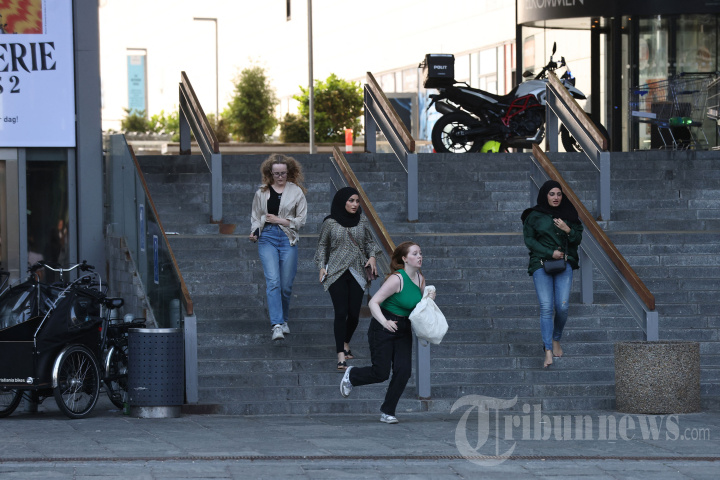 Orang-orang terlihat berlarian saat evakuasi pusat perbelanjaan Fields di Kopenhagen, Denmark, pada 3 Juli 2022 setelah media Denmark melaporkan penembakan. - Tembakan di sebuah mal Kopenhagen menyebabkan beberapa orang tewas, dan beberapa polisi Denmark yang terluka mengatakan. (Photo by Olafur Steinar Gestsson / Ritzau Scanpix / AFP) / Denmark OUT