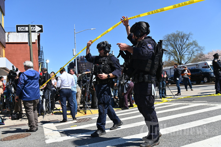 Personel darurat menyeberang di bawah pita polisi di dekat stasiun kereta bawah tanah di New York City pada 12 April 2022, setelah setidaknya 16 orang terluka dalam penembakan pada jam sibuk di wilayah Brooklyn di New York. (Photo by ANGELA WEISS / AFP)