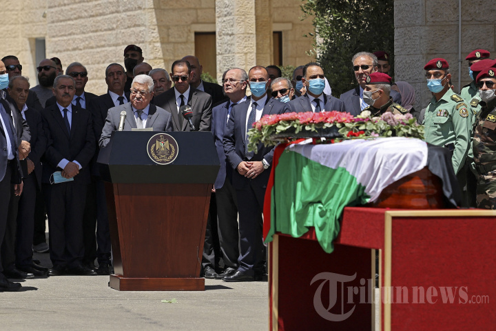 Presiden Palestina Mahmud Abbas mengucapkan selamat tinggal kepada jurnalis veteran Al-Jazeera Shireen Abu Akleh selama pemakaman kenegaraan di markas presiden di kota Ramallah, Tepi Barat, pada 12 Mei 2022. - Shireen Abu Akleh, yang terbunuh pada 11 Mei 2022 saat meliput serangan di Tepi Barat yang diduduki Israel, termasuk di antara tokoh media Arab yang paling menonjol dan dipuji secara luas karena keberanian dan profesionalismenya. Beberapa jam setelah kematiannya, pemuda Palestina menggambarkan Abu Akleh, 51 tahun, sebagai inspirasi, terutama bagi perempuan, yang banyak di antaranya termotivasi untuk menekuni jurnalisme karena dia.