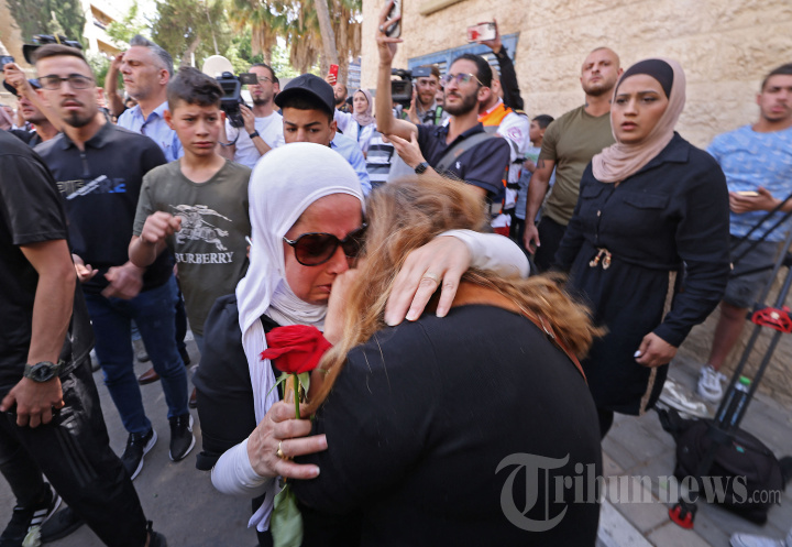 Orang-orang berkabung bereaksi ketika tubuh jurnalis veteran Al-Jazeera yang terbunuh Shireen Abu Akleh tiba di sebuah rumah sakit di lingkungan Sheikh Jarrah di Yerusalem timur, pada 12 Mei 2022. - Abu Akleh, yang ditembak mati pada 11 Mei 2022 saat meliput serangan di Tepi Barat yang diduduki Israel, termasuk di antara tokoh media Arab yang paling menonjol dan dipuji secara luas karena keberanian dan profesionalismenya. (Photo by AHMAD GHARABLI / AFP)