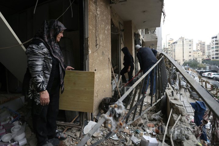Orang-orang membersihkan puing-puing dan reruntuhan dari apartemen mereka di pinggiran selatan Beirut pada tanggal 27 November 2024 saat orang-orang kembali untuk memeriksa rumah mereka setelah gencatan senjata antara Israel dan Hizbullah berlaku. (Photo by IBRAHIM AMRO / AFP)