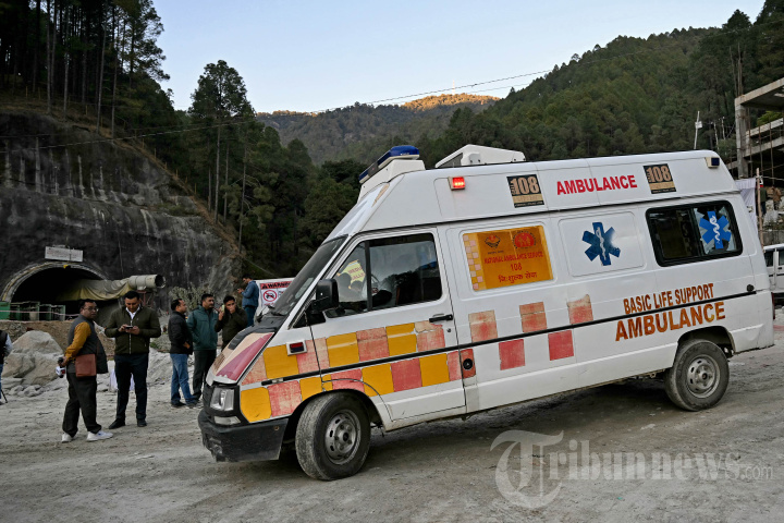 Ambulans tetap siaga saat operasi penyelamatan memasuki tahap terakhir, bagi para pekerja yang terjebak di terowongan jalan Silkyara yang sedang dibangun, beberapa hari setelah terowongan itu runtuh di distrik Uttarkashi di negara bagian Uttarakhand, India pada 22 November 2023. Tim penyelamat India telah mengebor dua- sepertiga jalan melewati puing-puing menuju 41 pekerja yang terjebak dalam terowongan jalan yang runtuh, kata para pejabat pada 22 November, memperingatkan bahwa 24 jam ke depan bisa jadi merupakan masa kritis. (Photo by Arun SANKAR / AFP)