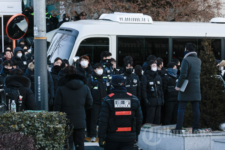 Petugas polisi mengamankan jalan ketika sebuah kendaraan berwarna putih meninggalkan kediaman Presiden Korea Selatan yang dimakzulkan Yoon Suk Yeol di Seoul, pada awal 15 Januari 2025. Penyelidik Korea Selatan mencoba menangkap Presiden yang dimakzulkan Yoon Suk Yeol pada 15 Januari karena upaya darurat militernya yang gagal , menggunakan tangga untuk memasuki kompleks kediamannya setelah terjadi bentrokan ketika pengawalnya memblokir gerbang utama. (Photo by YASUYOSHI CHIBA / AFP)