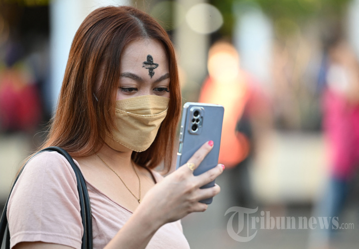 Seorang umat Katolik berfoto selfie setelah seorang biarawati mengoleskan abu di dahinya pada perayaan Rabu Abu di sebuah gereja di Manila pada 2 Maret 2022. (Photo by Ted ALJIBE / AFP)