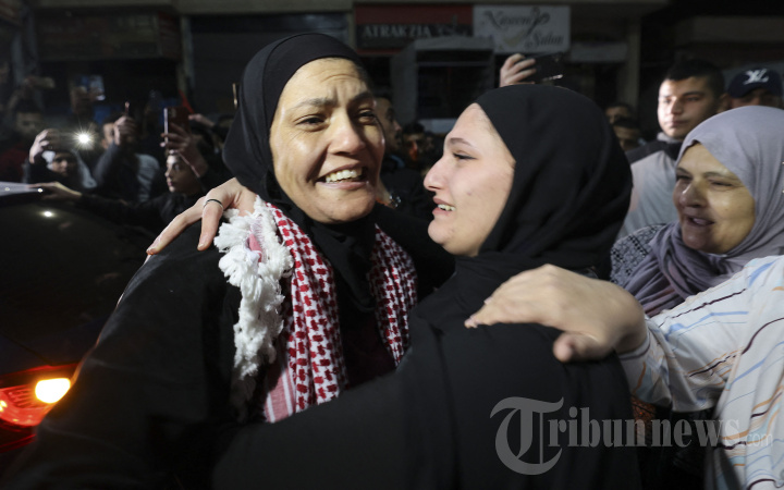 Rawda Abu Ajamieh (Kiri) memeluk seorang kerabat setelah dia dibebaskan dari penjara Israel sebagai bagian dari perjanjian gencatan senjata antara Israel dan Hamas di kamp pengungsi al-Duheishe di Tepi Barat yang diduduki Betlehem, 24 November 2023. Setelah 48 hari baku tembak dan pemboman yang merenggut ribuan nyawa, sandera pertama yang dibebaskan berdasarkan kesepakatan gencatan senjata antara Israel dan Hamas diserahkan pada 24 November, kata kedua belah pihak, hampir tujuh minggu setelah mereka ditangkap. (Photo by HAZEM BADER / AFP)