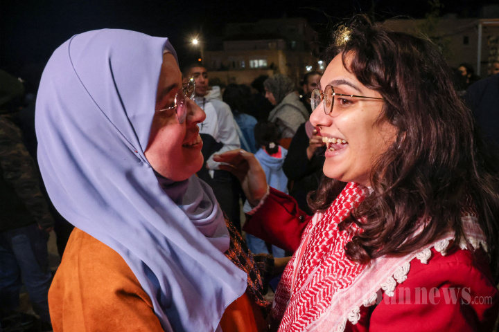 Raghad Fan (kanan) seorang tahanan Palestina yang ditahan di penjara Israel disambut oleh keluarganya saat dia dibebaskan berdasarkan kesepakatan gencatan senjata antara Israel dan Hamas dengan imbalan sandera yang ditahan di Gaza, di Baytunia di Tepi Barat yang diduduki pada 24 November 2023. Setelah 48 hari baku tembak dan pemboman yang merenggut ribuan nyawa, sandera pertama yang dibebaskan berdasarkan kesepakatan gencatan senjata antara Israel dan Hamas diserahkan pada 24 November, kata kedua belah pihak, hampir tujuh minggu setelah mereka ditangkap. (Photo by AHMAD GHARABLI / AFP)