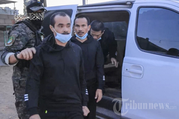 Gambar yang diambil dari video selebaran yang dirilis oleh Kantor Media Hamas menunjukkan anggota Brigade Al-Qassam menyandera pejabat Komite Palang Merah Internasional di Gaza pada 24 November 2023, sebelum mereka dipindahkan ke Israel. Setelah 48 hari baku tembak dan pemboman yang merenggut ribuan nyawa, sandera pertama yang dibebaskan berdasarkan kesepakatan gencatan senjata antara Israel dan Hamas diserahkan pada 24 November, kata kedua belah pihak, hampir tujuh minggu setelah mereka ditangkap. (Photo by Alex MITA / HAMAS MEDIA OFFICE / AFP)