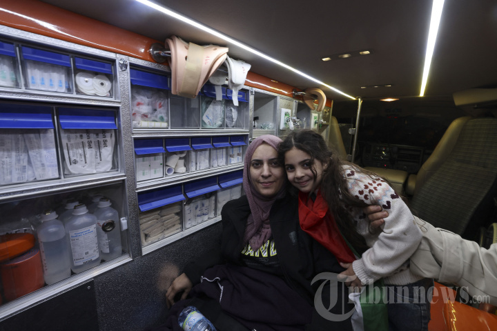 Karena tidak dapat berjalan, Fatima Shaheen memeluk putrinya Aylool saat dia duduk di dalam ambulans setelah dia dibebaskan dari penjara Israel sebagai bagian dari perjanjian gencatan senjata antara Israel dan Hamas di kamp pengungsi al-Duheishe di Tepi Barat yang diduduki Betlehem, 24 November 2023 Setelah 48 hari baku tembak dan pemboman yang merenggut ribuan nyawa, sandera pertama yang dibebaskan berdasarkan perjanjian gencatan senjata antara Israel dan Hamas diserahkan pada tanggal 24 November, kata kedua belah pihak, hampir tujuh minggu setelah mereka ditangkap. (Photo by HAZEM BADER / AFP)