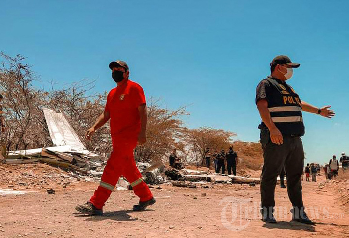 Dalam foto yang dirilis oleh NZK Canal 51 Keamanan dan penyelamat Nazca menghadiri lokasi jatuhnya pesawat kecil yang mengangkut wisatawan untuk mengamati Garis Nasca kuno di Peru selatan pada 4 Februari 2022, menewaskan tujuh penumpangnya. - Lima turis dan dua awak tewas Jumat ketika pesawat mereka jatuh dalam perjalanan untuk melihat jalur Nazca yang terkenal di Peru, kata kementerian transportasi. (Photo by NZK Canal 51 Nazca / AFP)