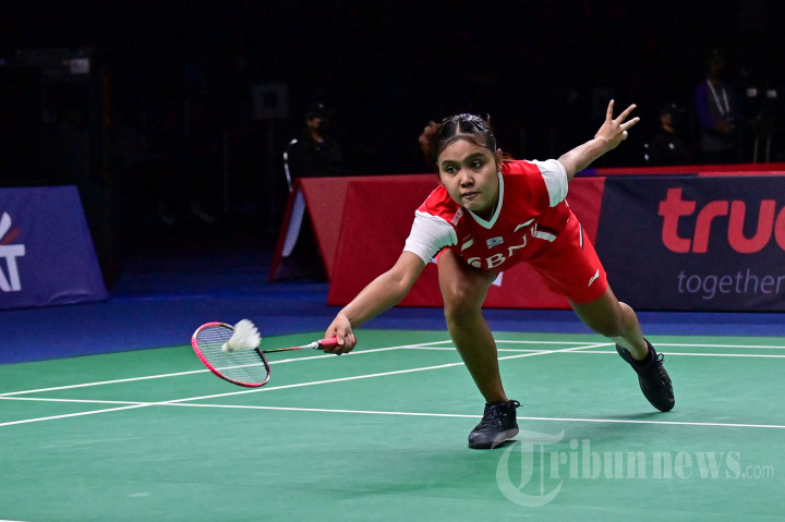 Pebulu tangkis tunggal putri Indonesia, Bilqis Prasista berusaha mengembalikan kok saat melawan pebulu tangkis Prancis, Yaelle Hoyaux dalam babak penyisihan Grup A Piala Uber (Uber Cup) 2022 di Impact Arena, Bangkok, Thailand, Minggu (8/5/2022). Bilqis Prasista sukses mengalahkan Yarlle Hoyaux lewat rubber game dengan skor 17-21, 21-14, 21-18. AFP/LILLIAN SUWANRUMPHA