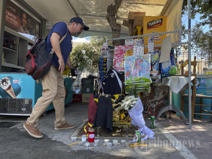 Seorang pria meletakkan bunga, di lokasi di mana seorang penggemar Yunani berusia 29 tahun meninggal setelah bentrokan semalam antara pendukung saingan di pinggiran Nea Philadelphia, di Athena, Yunani, Selasa, 8 Agustus 2023. Badan sepak bola Eropa UEFA mengatakannya telah menunda pertandingan kualifikasi Liga Champions antara AEK Athens dan Kroasia Dinamo Zagreb dijadwalkan Selasa karena kekerasan. Delapan suporter terluka sementara polisi Yunani mengatakan pada Selasa bahwa mereka telah menangkap 88 orang, sebagian besar suporter Kroasia.