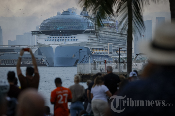 Orang-orang menyaksikan Icon of the Seas milik Royal Caribbean, yang disebut-sebut sebagai kapal pesiar terbesar di dunia, berlayar dari Pelabuhan Miami di Miami, Florida, dalam pelayaran perdananya, 27 Januari 2024. (Photo by Marco BELLO / AFP)