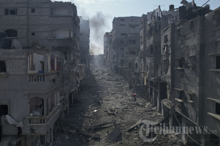 Puing-puing berserakan di jalan di antara bangunan-bangunan yang membara akibat serangan udara Israel di Jabaliya, Jalur Gaza, Rabu, 11 Oktober 2023. (AP Photo/Hatem Moussa)