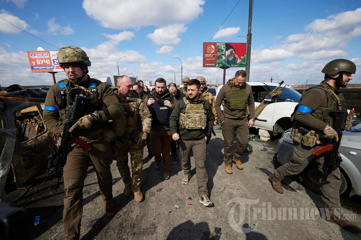 Sebuah gambar selebaran yang diambil dan dirilis pada 4 April 2022 oleh layanan pers kepresidenan Ukraina menunjukkan Presiden Ukraina Volodymyr Zelensky (tengah) berjalan di kota Bucha, barat laut ibukota Ukraina, Kyiv. - Presiden Ukraina Volodymyr Zelensky mengatakan pada 3 April 2022 bahwa kepemimpinan Rusia bertanggung jawab atas pembunuhan warga sipil di Bucha, di luar Kyiv, di mana mayat-mayat ditemukan tergeletak di jalan setelah kota itu direbut kembali oleh tentara Ukraina. Kementerian Pertahanan Rusia menolak tuduhan pada hari yang sama dengan alasan bahwa pasukan Rusia meninggalkan Bucha pada 30 Maret sementara bukti pembunuhan disajikan empat hari kemudian. (Photo by UKRAINIAN PRESIDENTIAL PRESS SERVICE / AFP)