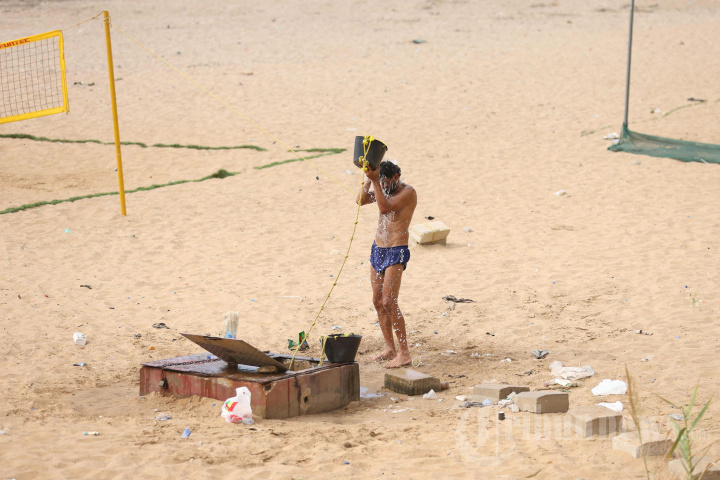 Seorang pria mencuci dirinya dengan air sumur saat keluarga-keluarga pengungsi berlindung di perkemahan darurat di atas pasir pantai Ramlet al-Bayda di Beirut pada 10 Oktober 2024. - Pertukaran lintas batas yang telah berlangsung selama setahun antara Israel dan kelompok Hizbullah Lebanon setelah meletusnya perang Gaza, telah meningkat secara dramatis pada bulan sebelumnya, yang mendorong sekitar 1,2 juta orang mengungsi, sebagian besar sejak 23 September, menurut pejabat Lebanon. (Photo by IBRAHIM AMRO / AFP)