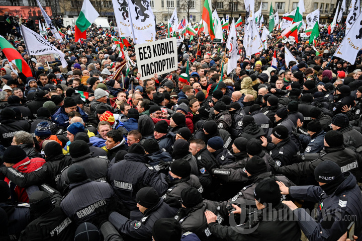 Sekitar 2.000 pengunjuk rasa, yang tidak mengenakan masker atau mematuhi jarak sosial, mendorong barisan polisi ketika mereka mencoba memasuki gedung parlemen Bulgaria selama demonstrasi yang diselenggarakan oleh partai politik nasionalis Vazrazhdane, yang mendorong penghapusan Covid-19 kartu kesehatan di Sofia, pada 12 Januari 2022. - Bulgaria memiliki tingkat vaksinasi terendah di Uni Eropa, dengan para ahli menyalahkan keraguan pada kepercayaan yang rendah pada pihak berwenang dan teori konspirasi yang meluas, seperti yang didaftarkan negara itu pada 12 Januari 2022, setiap hari rekor 7.062 infeksi baru. (Photo by Nikolay DOYCHINOV / AFP)