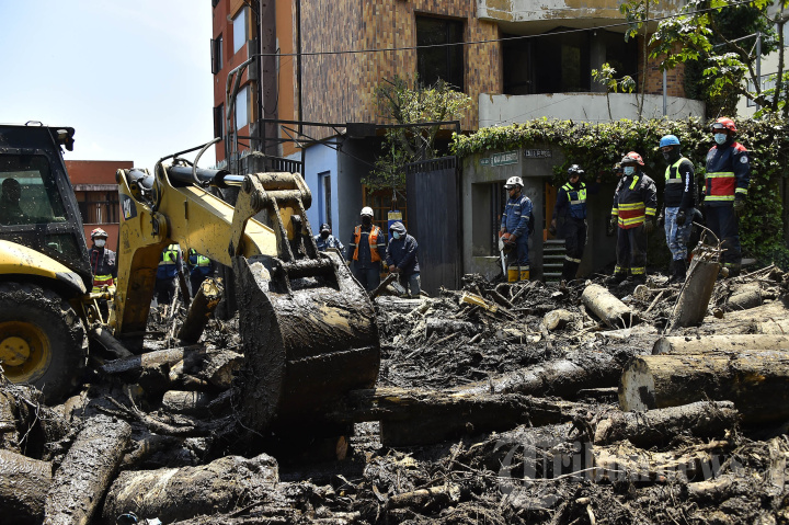 Petugas penyelamat terlihat di lokasi di mana lapangan olahraga disapu bersih, di Quito pada 2 Februari 2022. - Banjir terparah yang melanda Ekuador dalam dua dekade telah menewaskan sedikitnya 24 orang di Quito, menggenangi rumah, membanjiri mobil, dan menyapu bersih atlet dan penonton di lapangan olahraga, kata para pejabat Selasa. (Photo by Rodrigo BUENDIA / AFP)