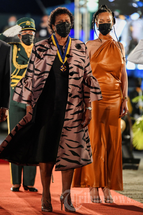 Presiden Barbados, Dame Sandra Mason dan Rihanna berdiri selama Upacara Pelantikan Presiden di Heroes Square pada 30 November 2021 di Bridgetown, Barbados. Pangeran Wales tiba di negara itu sebelum transisinya menjadi republik di dalam Persemakmuran. Minggu ini, mereka secara resmi mencopot Ratu Elizabeth sebagai kepala negara dan gubernur jenderal saat ini, Dame Sandra Mason, akan dilantik sebagai presiden. Toby Melville - Pool/Getty Images/AFP (Photo by WPA POOL / GETTY IMAGES NORTH AMERICA / Getty Images via AFP)