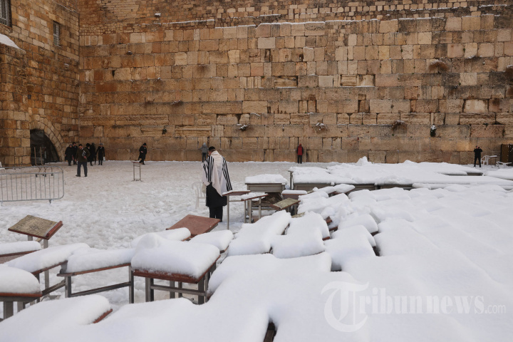 Salju menutupi tanah di Tembok Barat di Yerusalem pada 27 Januari 2022. (Photo by Menahem KAHANA / AFP)
