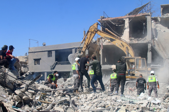 Pekerja pertahanan sipil menggali reruntuhan bangunan di lokasi serangan udara Israel semalam yang menargetkan lingkungan di kota timur Baalbek pada tanggal 30 September 2024. (Photo by AFP)