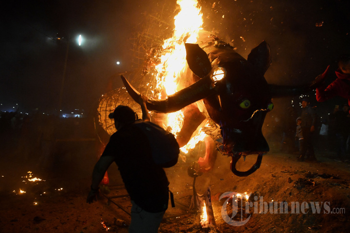 Orang-orang berlindung sementara yang lain berlarian di sekitar torito (banteng kecil), bingkai kembang api yang terbuat dari mache kertas, buluh, kayu dan kabel dalam bentuk banteng, selama perayaan San Juan de Dios diadakan dalam rangka Festival Kembang Api Nasional, di Tultepec, Negara Bagian Meksiko, Meksiko, pada 8 Maret 2023. (Photo by Claudio CRUZ / AFP)