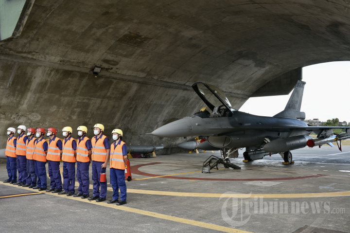 Tentara Angkatan Udara berdiri di depan jet tempur F-16V bersenjata selama latihan di pangkalan Angkatan Udara Hualien pada 17 Agustus 2022. (Photo by Sam Yeh / AFP)