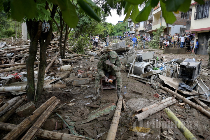 Seorang tentara Kolombia beristirahat duduk di puing-puing yang ditinggalkan oleh tanah longsor yang disebabkan oleh hujan lebat di Pereira, departemen Risaralda, Kolombia, pada tanggal 8 Februari 2022. - Tanah longsor tersebut menyebabkan 7 orang tewas dan 29 orang luka-luka di lingkungan Pereira pada hari Selasa, akibat hujan lebat di beberapa hari terakhir, menurut pihak berwenang. (Photo by Luis ROBAYO / AFP)