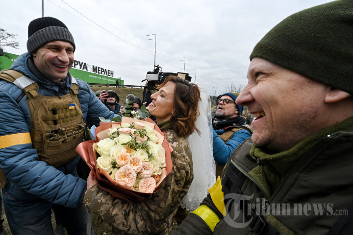 Walikota Kyiv Vitali Klitschko mengucapkan selamat kepada prajurit pertahanan teritorial Ukraina, Valery (kanan) dan Lesya (tengah), dengan pernikahan mereka tidak jauh dari pos pemeriksaan di pinggiran Kyiv pada 6 Maret 2022.