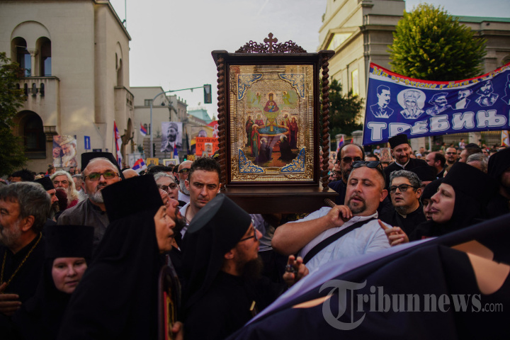 Orang-orang percaya Kristen Ortodoks berkumpul selama Litiya untuk keselamatan Serbia di Beograd, pada 28 Agustus 2022. - Ribuan orang percaya berbaris menentang diadakannya acara LGBT internasional Euro Pride, yang akan berlangsung bulan depan di ibukota Serbia. (Photo by OLIVER BUNIC / AFP)