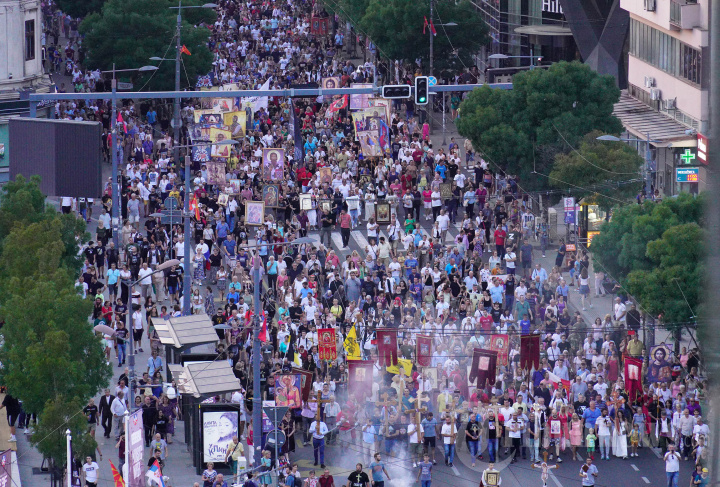Umat ??Kristen Ortodoks memegang ikon dan salib selama Litiya untuk keselamatan Serbia di Beograd pada 28 Agustus 2022. - Ribuan orang percaya berbaris menentang penyelenggaraan acara LGBT internasional Euro Pride, yang akan berlangsung bulan depan di ibukota Serbia . (Photo by OLIVER BUNIC / AFP)