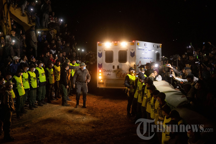 Orang-orang melihat saat ambulans pergi dari tempat di mana kru penyelamat bekerja untuk menarik Rayan Oram yang berusia lima tahun dari lubang sumur tempat dia jatuh pada 1 Februari, di desa terpencil Ighrane, di pedesaan provinsi utara. Chefchaouen pada 5 Februari 2022. (Photo by FADEL SENNA / AFP)