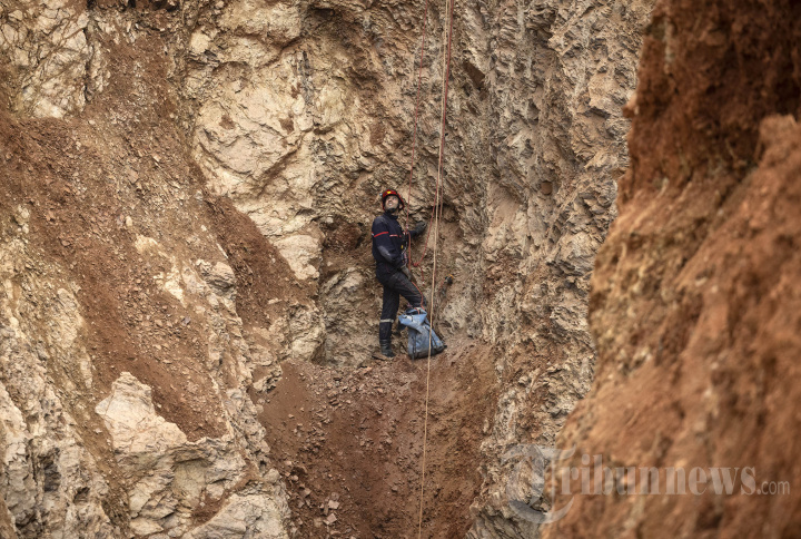 Seorang pendaki layanan darurat Maroko bekerja untuk menyelamatkan bocah laki-laki berusia lima tahun, Rayan, dari lubang sumur yang dia jatuhi pada 1 Februari, di desa terpencil Ighrane di provinsi utara pedesaan Chefchaouen pada 4 Februari 2022. - Tim penyelamat Maroko berada di tahap akhir yang menegangkan dari upaya maraton untuk menyelamatkan Rayan, seorang bocah lelaki berusia lima tahun yang terperangkap di dalam sumur untuk malam keempat. (Photo by Fadel SENNA / AFP)