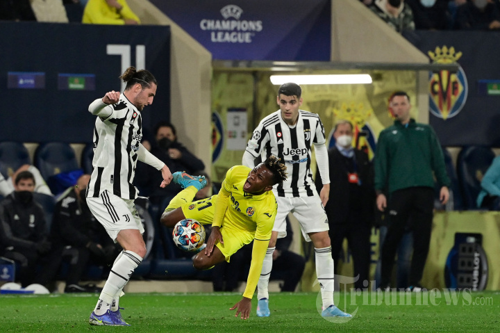 Gelandang Villarreal asal Nigeria, Samuel Chukwueze (tengah) terjatuh saat berebut bola dengan gelandang Juventus asal Perancis, Adrien Rabiot (kiri) dalam laga leg pertama babak 16 besar Liga Champions antara Villarreal melawan Juventus di Stadion La Ceramica, Vila-real, Spanyol, Rabu (23/2/2022) dini hari WIB. Pertandingan berakhir imbang dengan skor 1-1 (0-1). AFP/JAVIER SORIANO