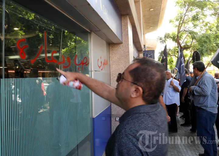 Seorang pria membaca grafiti yang disemprotkan di sepanjang fasad sebuah bank di ibukota Lebanon Beirut, setelah seorang wanita menyerbunya menuntut akses ke simpanan saudara perempuannya untuk diduga membayar biaya rumah sakit, pada 14 September 2022. Tulisan dalam bahasa Arab berbunyi bank kecurangan dan prostitusi. - Bank-bank Lebanon sejak 2019 secara bertahap memberlakukan kontrol kejam pada simpanan, secara efektif mengunci pelanggan dari tabungan mata uang asing mereka, dalam sebuah langkah yang telah mendorong serangkaian perampokan bank oleh orang Lebanon yang mencoba merebut kembali akses ke uang mereka. (Photo by ANWAR AMRO / AFP)
