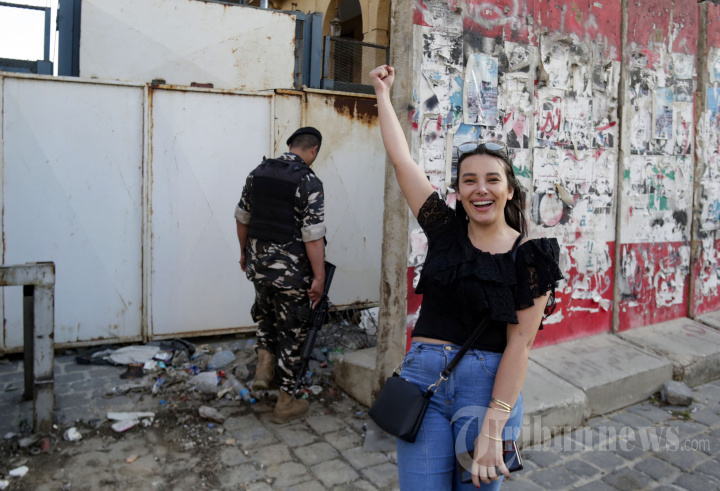 Sali (Saly) Hafiz, seorang aktivis muda Lebanon yang pada 14 September 2022 mengangkat sebuah bank Beirut dengan pistol mainan dan berjalan keluar dengan ribuan dolar untuk membayar pengobatan saudara perempuannya yang sakit, difoto saat demonstrasi di distrik pusat kota ibukota, pada 23 Mei 2022. - Insiden itu adalah yang terbaru dari serangkaian perampokan di Lebanon, di mana tabungan para deposan telah didevaluasi dan terjebak di bank selama hampir tiga tahun di tengah krisis ekonomi yang melumpuhkan. (Photo by ANWAR AMRO / AFP)