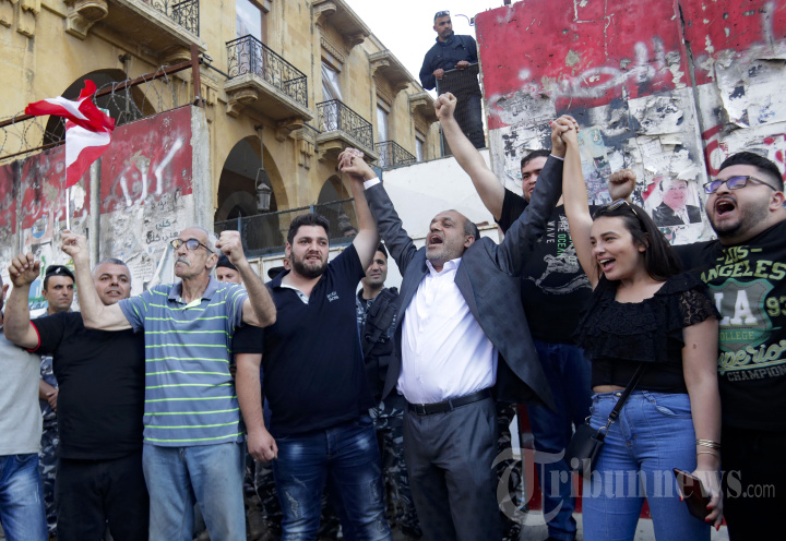 Sali (Saly) Hafiz (2-kanan), seorang aktivis muda Lebanon yang pada 14 September 2022 mengangkat sebuah bank Beirut dengan pistol mainan dan berjalan keluar dengan ribuan dolar untuk membayar pengobatan saudara perempuannya yang sakit, berfoto dengan sesama aktivis, termasuk anggota parlemen independen Yassin Yassin (3 kanan) selama demonstrasi di distrik pusat kota ibukota, pada 23 Mei 2022. - Insiden itu adalah yang terbaru dari serangkaian perampokan di Lebanon, di mana simpanan para deposan telah didevaluasi dan terjebak di bank selama hampir tiga tahun di tengah krisis ekonomi yang melumpuhkan. (Photo by ANWAR AMRO / AFP)
