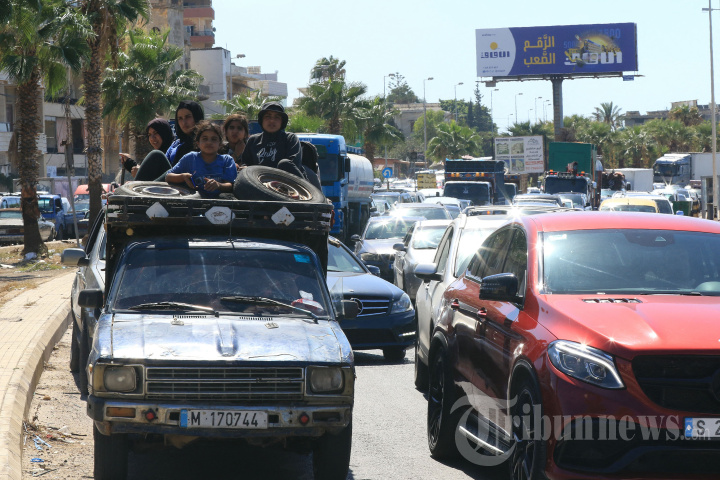 Keluarga Suriah duduk dengan barang-barang mereka di belakang truk saat mereka menunggu di tengah kemacetan lalu lintas di kota Sidon, Lebanon selatan, pada tanggal 23 September 2024. - Militer Israel pada tanggal 23 September memberi tahu orang-orang di Lebanon untuk menjauh dari target-target Hizbullah dan berjanji untuk melakukan serangan yang lebih "luas dan tepat" terhadap kelompok yang didukung Iran tersebut. (Photo by Mahmoud ZAYYAT / AFP)