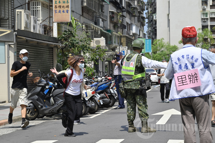 Personel militer memandu penduduk setempat untuk berlindung selama Latihan Serangan Udara Wanan, latihan serangan udara sipil yang diadakan pada hari yang sama dengan latihan militer tahunan Han Kuang, di Taipei pada 25 Juli 2022. (Photo by Sam Yeh / AFP)