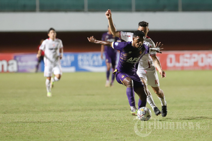 Pemain Persik Kediri berebut bola dengan pemain Persis Solo Messidoro pada pertandingan Liga 1 di Stadion Maguwoharjo, Sleman, Yogyakarta, Sabtu (24/12/2022). Babak pertama kedua tim saling balas gol hingga wasit meniupkan pluit akhir babak pertama skor imbang 1-1. Tribunnews/Jeprima