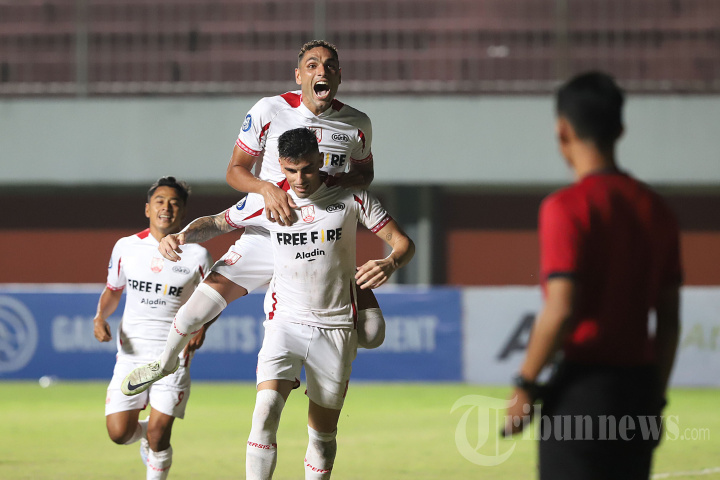 Selebrasi pemain Persis Solo Rodriguez bersama rekan setimnya usai berhasil mencetak gol saat bertanding melawan Persik Kediri pada pertandingan Liga 1 di Stadion Maguwoharjo, Sleman, Yogyakarta, Sabtu (24/12/2022). Persis Solo menunjukkan kehebatannya usai berhasil mengalahkan Persik Kediri dengan skor 1-3. Tribunnews/Jeprima